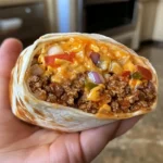 Now comes the fun part! Take a warm tortilla and place a generous amount of the beef and rice mixture in the center. Don’t be shy—load it up! Then, sprinkle some shredded cheddar cheese on top. The cheese will melt beautifully when you roll it up.